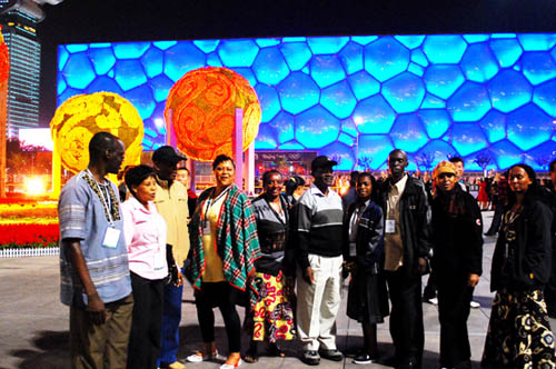 L’après-midi, on est arrivé au Nid d’oiseau et au Cube d’eau où étaient les terrains du sport principaux des Jeux Olympiques. « Le Nid d’oiseux est ainsi gigantesque ! » Tous les distributeurs ont dit comme ça. La musique « Bienvenue à Beijing » a retenu et avec le rythme, tous les distributeurs ont visité en chantant et ont pris des photos devant les mascottes. Pendant la soirée, toutes les lampes autours du terrain sport ont allumé, le Nid d’oiseau et le Cube d’eau se reflétaient. MERCY NYADZUA MWANGALA a dit que « c’est le terrain le plus beau que j’ai déjà vu ; c’est très beau, Beijing ! » Tous les distributeurs étaient très contents et ils ont pris une photo ensemble avec le rouge Nid d’oiseau derrière eux.