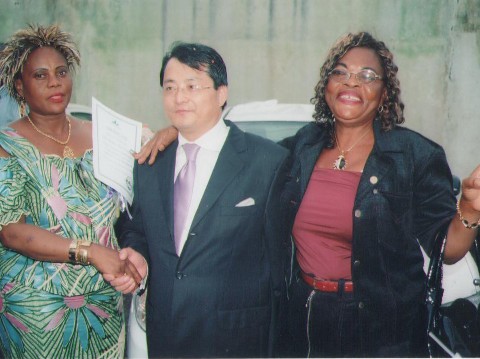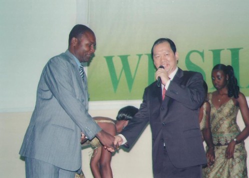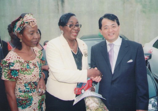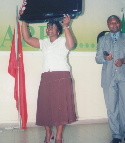 Madame Ngameloua Marie, la distributrice couronnée du Prix de Voiture, est très reconnaissante à Green World d’offrir une plate-forme et serre chaleureusement la main à Monsieur le président David Zhang.