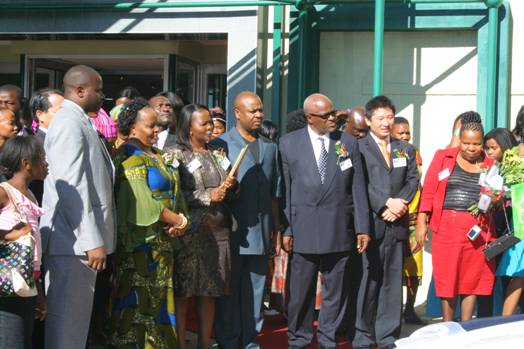 Avec l'accompagnement de la musique de fond et des applaudissements passionnés de distributeurs, M. David L Zhang, avec Mme Pohamba Penehupifo, Première Dame de la Namibie, M. Joseph Auala, directeur exécutif par intérim de OEWONA, d’autres VIP fonctionnaires du gouvernement local, William Zhang, directeur général de Green World Namibie et son équipe de gestion, des distributeurs supérieurs, y compris Mme Thembisile Ngidi, leader supérieur du réseau en Afrique du Sud et Mme Hertta Nekuvu Etuhole IITA, lauréat de voiture Mercedes Benz, est entré dans la salle de conférence.