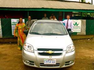 Devant l’entrée du magasin, les managers de No. 570 se sont fait photographier avec voiture récompensée par Green World.