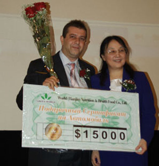 Dans l’activité de tirage au sort, le distributeur a pris 20 prix précieux : Coussin de masser, Machine à Ozone électronique, Bleuet Super Nutrition et les série de napkins. Lusilan, la partenaire et le directeur de GREEN WORLD d dit qu’il est facile de gagner la monnaie par faire une coopération avec GREEN WORLD et exprimer la merci au président Li. Les lauréats de distributeurs a exprimé la merci à la société et il a la confiance de obtenir la réussite plus grande.