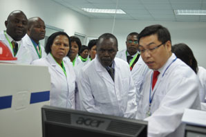 Madame Deming Li, le président général de GROUPE GREEN WORLD, madame Huiguang Tian, le directeur de la santé de Tianjin, ont reçu PAUSE, GRACE, WILLFORD, PATRICK, les directeurs de Malawi FDA.