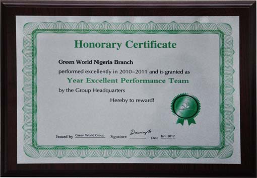Le siège de GROUPE GREEN WORLD a décerné équipe de brillant exploit excellent de 2010-2011 à la filiale nigériane de GREEN WORLD.