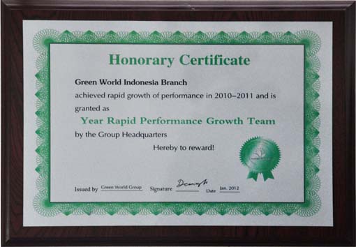 Le siège de GROUPE GREEN WORLD a décerné équipe de brillant exploit d’agrandir rapide de 2010-2011 à la filiale indonésienne de GREEN WORLD.