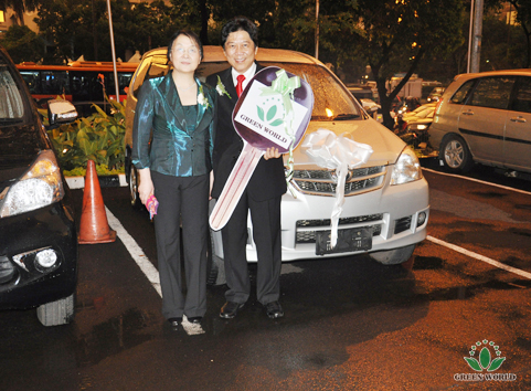 Président Li 、Président de la zone de l’Asie du Sud-Est ,directeur de la filiale de Green World XiaoYonghong décernent le certificat du prix de voiture et donnent la clé aux couples MARYADY