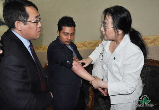 Président Li examine personellement la peau du malade après avoir pris les priduits de Green World