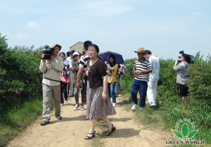 Président Li et les participants de séminaire de haut niveau sur le développement de l’industrie de bleuet de la Chine en 2012 visitent la base de bleuet.