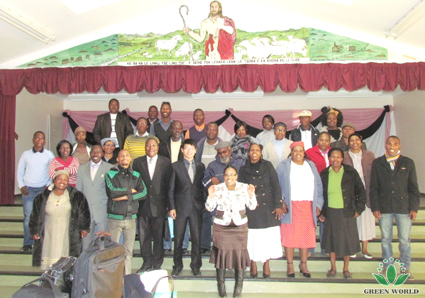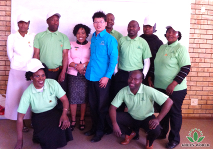 En mai de cette année, directeur de la filiale de Green World de l’Afrique du sud Huang Shangren prend la photo avec les distributeurs à Maseru