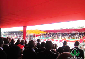CONGO,SANTÉ ET BONHEUR AU PEUPLE CONGOLAIS. Les autres personnes mettent T-shirt, chapeau, tient un petit drapeau de l’entreprise, le slogan fort est plein du lieu de la réunion qui manifeste la vigueur et la culture de Green World. Quand l’équipe passe par la tribune, le président de la république du Congo : Monsieur Denis Sassou-Nguesso salue l’équipe de la filiale de Green World à Congo-Brazzaville.