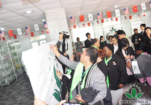 Le 16 novembre 2012, le siège social de Green World Groupe à Tianjin est plein de drapeaux flottants et des gens, l’ambiance et très animées, la filiale à Canada en provenance de zone d’Amérique du Sud et l’équipe de distributeurs de zone chinoise se rencontrent en Chine avec la gloire, le rêve, l’attente et la bénédiction pour faire cette visite. Green World Groupe attache une grande importance à cette visite de distributeurs, assistante de