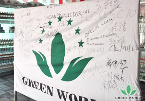 Distributeurs signent leurs noms et leurs voeux sur Green World au drapeau de Green World