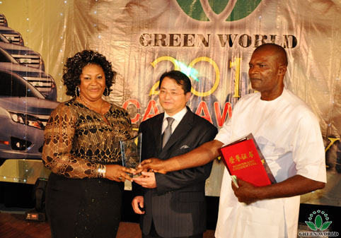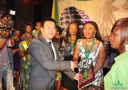Vice-président de Green World Groupe, président de zone d’Afrique Monsieur Zhang décerne le prix à directeur général de 3 étoiles Mademoiselle NGOZI
