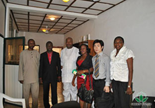Directeur de la filiale de Groupe Green World à Abuja Monsieur Xiaoju Qiu prend la photo avec le propriétaire de magasin et son équipe