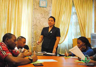Directeur de la filiale de Groupe Green World à Clabar Madame Yuxue Zhang prend la parole au cours de la réunion