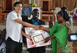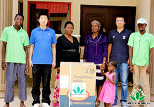 Directeur de la filiale de Groupe Green World à Ghana Monsieur Fushun Sun décerne le certificat et le cadeau au distributeur