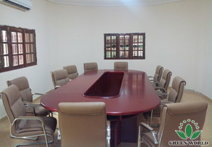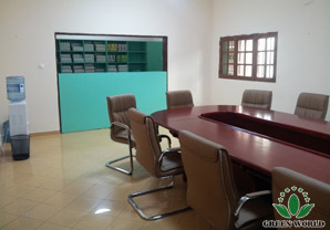 Scène intérieure de la filiale de Green World à l’Angola : salle de réunion et comptoir de vente