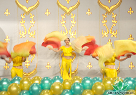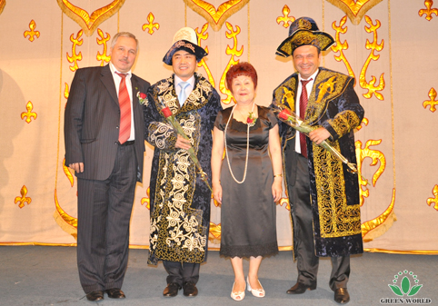 Leader du distributeur de la filiale au Kazakhstan Madame Hwang Zinaida fait cadeau du costume national à Vice-Président de Groupe Green World, Président de Green World Europe-Asie Monsieur Yanguo Chen et à leader de distributeur de haut niveau de la filiale à l’Ukraine Monsieur Ruslan pour exprimer son remerciement