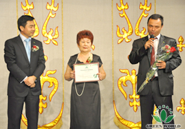 Président de Groupe Green World, Président de Green World Europe-Asie Monsieur Yanguo Chen décerne le prix de voiture au maître d’émeraude Madame Hwang Zinaida