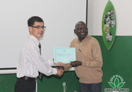Directeur de la filiale de Green World au Congo-Brazzaville Monsieur Yongjun Deng décerne le certificat de formation aux distributeurs