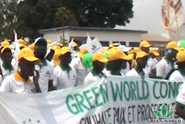 Equipe de la filiale de Green World au Congo-Brazzaville marche devant la tribune en tenant les banières