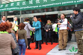 Dr Deming Li, présidente de Groupe Green World, chaleureusement accueille les amis de la région eurasienne et prend des photos avec des distributeurs, M. Yanguo Chen, vice-président de Groupe Green World et président de la région eurasiatique et Mme Xiaohong Wang, directrice de la filiale de Group Green World en Ukraine