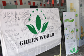 Distributeurs signent leurs noms sur le drapeau de Green World et écritent les meilleurs vœux pour Green World
