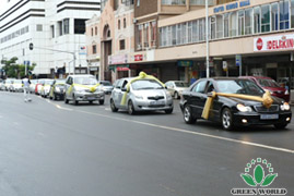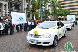 Lecortège composé de 22 voitures commerciales de Green World conduitent au lieude conférence—Hall de Mairie de Durban