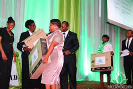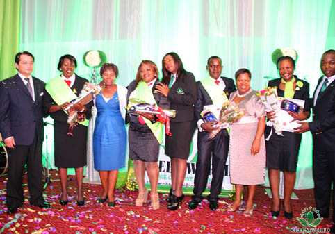 MmeNgidi Thembisile, distributrice de haut niveau de l’Afrique du Sud de Groupe GreenWorld, et M. Tendai Chinoperekwei, distributeur de haut niveau et conférencierinternational du Zimbabwe de Green World, présentent le prix de TV aux 5distributeurs 5 étoiles qui ont gagné la croissance rapide 5 étoiles