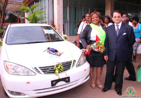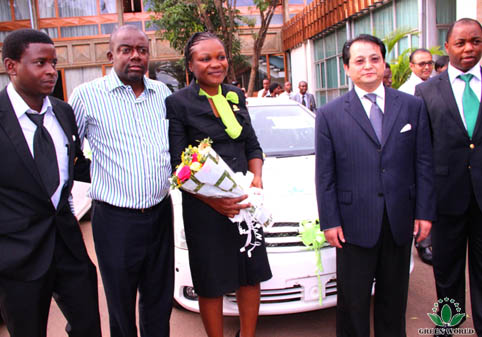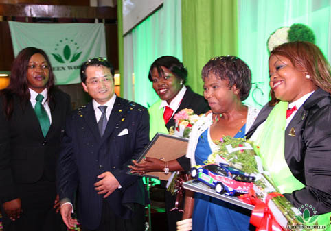 M. DavidL. Zhang, vice-président de Groupe Green World et président de Groupe GreenWorld, et Mme Patricia Nawa, ancien maire de Lusaka, la capitale de la Zambie, présententconjointement des prix aux 4 lauréats de voitures commerciales