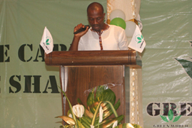 Employé de la filiale de Green World Cameroun international lit les mots de félicitations de M. David L. Zhang, vice-président de Green World et président de Green World Afrique
