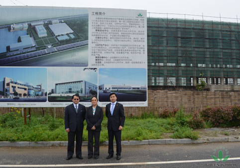 Présidente Dr Deming Li et vice-président M. David L. Zhang, ainsi que vice-président M. Guo Yan Chen prennent une photo de groupe devant le projet Nanjing Lishui en construction (Nanjing Lishui parc de l'industrie de la santé, Silicon agricole vallée de l'écologie originale approuvé par l'État)