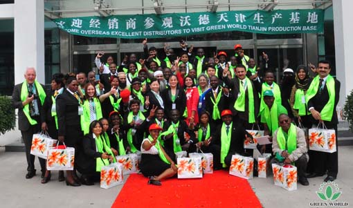 Le 19 mai 2014, d'excellents distributeurs à l'étranger gagnant le prix du voyage international ont visité la base de Green World à Tianjin en ce jour de fête. A 9 heurs 30, à la performance de la danse du lion jubilatoire et festive, les distributeurs sont venus à l'heure dite. Ils ont marché sur le tapis rouge, des distributeurs de l'Afrique du Sud, du Swaziland, du Zimbabwe, de la Zambie, du Kenya, du Ghana, de l'Angola, du Congo-Kinshasa, du Pakistan et du Canada sont entrés dans la base à Tianjin avec un esprit élevé. Groupe Green World a tenu la cérémonie de bienvenue grande pour les amis de loin. Dr Deming Li, présidente de Green World, en collaboration avec l'équipe de direction de Green World aligné pour les distributeurs mondiaux de différentes nationalités et couleurs de peau d'exprimer la salutation sincère et de partager l’éclat avec tout le monde !