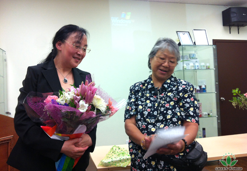 Représentante du distributeur de la filiale au Canada Mme Amy a offert des fleurs et un cadeau au Mme Deming Li