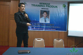 La réunion de formation sur les produits est réalisée en deux étapes. La première étape est l’explication du produit: consultant en santé M. Tommy l'efficacité et les avantages des produits, tels que Huile de Poisson de Mer Profonde, Lécithine Gélule, Cardio-Puissance Capsule, Ovaire Nutrition Capsule, Masse-Dispersion, etc.