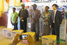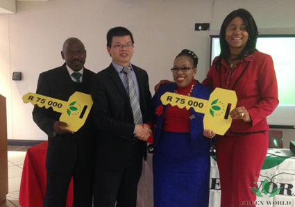 M. Bruce Huang, directeur général de la filiale de East London de Green World en Afrique du Sud,a décerné le prix de Voiture à M. PATRICK, Mme EVODIA et Mme Roselina