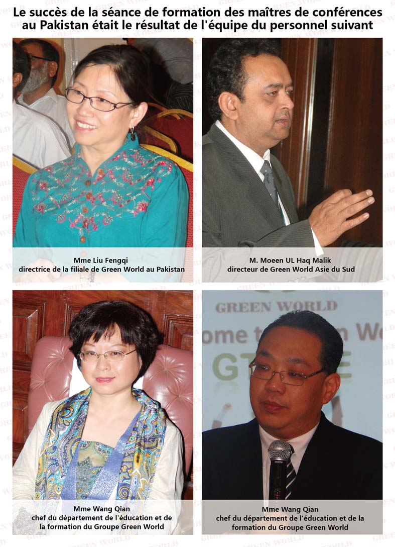 M. Moeen UL Haq Malik, directeur de l'éducation de Green World Asie du Sud, Mme Wang Qian, chef du département de l'education et de la formation de Green World, M. Budiman PRASETYO, maître de conférences du département de l'education et de la formation de Green World ont apporté trois thèmes de formations sur le marketing, les produits et la présentation. M. Moeen UL Haq Malik a fait une analyse sur le renforcement de l'équipe et la formation du leadership; M. Budiman Prasetyo a élaboré la méthode normalisée OPP et les plans de carrière; Mme Wang Qian a fait une superbe démonstration et présentation sur des produits de Green World et des produits classé TOP 1-10 au Pakistan. Les cours de formation merveilleux ont gagné les éloges de tout le monde, les participants tous étaient pleins d'énergie, ont fait une étude sérieuse, écouté attentivement et ils ont dit: ils iraient profiter des connaissances et de la présentation pratique pour développer de nouveaux marchés et fournir un service plus attentionné!
