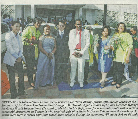 Le 28 février 2015, Blue Pearl Hotel de Dar es-Salaam, la capitale de la Tanzanie, était plein de drapeaux flottants, de la chanson et du rire. La réunion du décernement de la voiture en 2014 de la filiale de Green World en Tanzanie s’est tenue ici. Vice-président de Green World et président de Green World Afrique M. David L. Zhang était invité à cette réunion. Mlle Yao Ma, directrice de la filiale en Tanzanie et des représentants de distributeurs de la Tanzanie, du Kenya, de la Zambie sont entrés joyeusement dans la salle, environ 400 distributeurs ont assisté à cet événement.