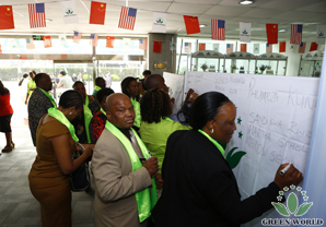 Des distributeurs ont écrit leurs noms et leurs bons voeux au Green World sur le drapeau de Green World