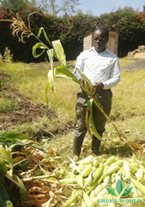 M. Kennedy Kegode, un leader supérieur de la filiale de Green World au Kenya, a montré son résultat étonnant dans sa ferme de maïs après l'application de Green World Nutriplant Organic Plus Fertilizer