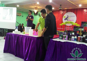 Afin d'accroître la connaissance des consommateurs de Green World à Bengkalis sur des produits de bleuets, Dr.Tommy en tant que maître de cette activité, a introduit détailléement les avantages des produits de bleuets de Green World et a fait une démonstration sur la résistance à l'oxydation de bleuets, cette démonstration a gagné des applaudissements et des acclamations, ils ont fait l'éloge des produits de bleuets de Green World. Après le discours de Dr.Tommy, le présentateur a invité 4 consomateurs sur scène à partager leurs sentiments après l'utilisation de produits de bleuets de Green World. Ils ont respectivement partagé l'effet d'amélioration de Concentré Liquide de Bleuet sur de divers problèmes de santé.