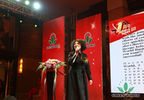 Mme Deming Li a pris la parole dans des acclamations et des applaudissements assourdissants. Elle a présenté un accueil chaleureux à la famille de Green World dans le monde. Elle a souligné dans son discours le concept de la santé dans le monde entier, et souhaité que Green World Chine pouvait développer stablement et devenu un important leader des marchés de Green World.