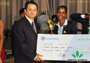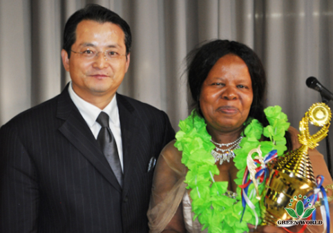 M. David L. Zhang, vice-président de Green World et président de la région africaine a décerné le prix à Mme NGIDI THEMBI, directeur 1 étoile nouvellement promu