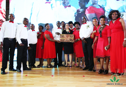 Les distributeurs de la région africaine, présentant leur cadeau, un sac à main spécial de Green World à Dr Deming Li