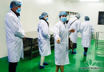M. Yanguo Chen, vice-président de Green World et Mme Xiaohong Wang, directrice de la filiale de l'Ukraine, ont accompagné les partenaires européens dans l’atelier de production GMP de Green World. Mme Xiaohong Wang a décrit en détail le processus d'opération de l’atelier de production GMP de Green World aux partenaires européens.