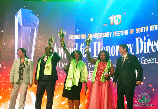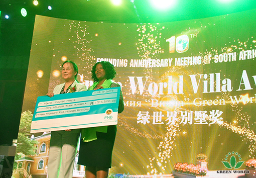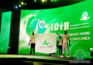 Green World a opéré en Afrique du Sud depuis 10 ans et fait de son mieux pour développer un mode de vie sain pour le grand public en Afrique du Sud.Elle a fourni des opportunités d'affaires égales et une plate-forme de croissance personnelle hautement reconnue et soutenue par le gouvernement sud-africain. Nompumeleo Ntuli Zuma, l'épouse du président sud-africain, est venue à la réunion et a prononcé un discours pour récompenser les lauréats. Le président sud-africain a également envoyé un représentant spécial présidentiel pour assister à cette réunion.