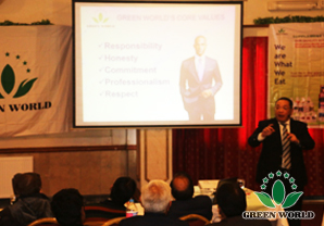 La formation des dirigeants de Green World a compris 2 parties. La première est la formation spéciale de santé de Dr et Licence en médecine Simon Alfred, dirigeant de 7 étoiles de Green World à Lahore. Il a dirigé brièvement la formation de la santé de Green World. En tant que distributeur de Green World, on doit offrir l'éducation sanitaire et renforcer la sensibilisation de la santé aux populations pakistanaises, et a fourni des informations sur les produits de santé de Green World.