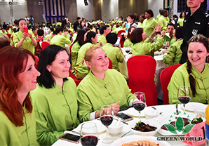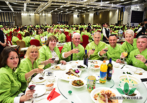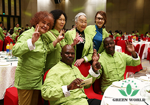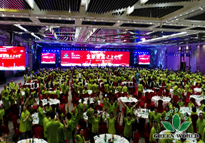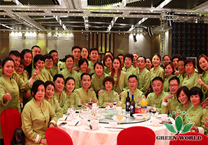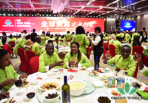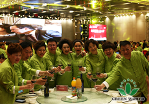 À 18 h, les élites de Green World est venue à la salle de banquet, vêtue de costumes Tang fabriqués sur mesure par l'entreprise pour ce dîner: le vert représente la nature et l'espoir! Aujourd'hui, 5 continents se rassemble et les invités sont pleins, le marché chinois de demain commence à créer la gloire, aujourd'hui, griller et boire, pas saoul !