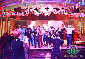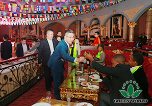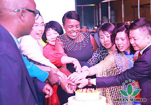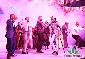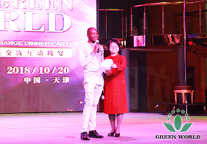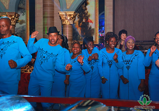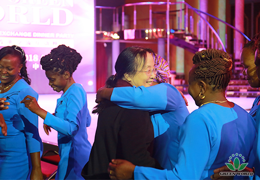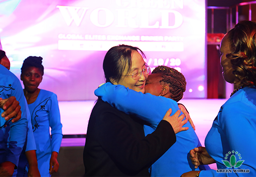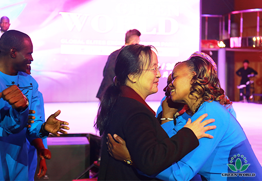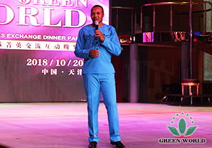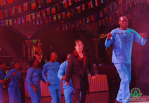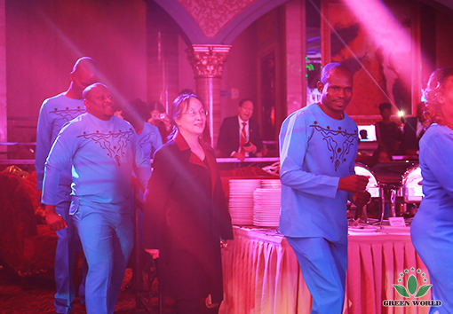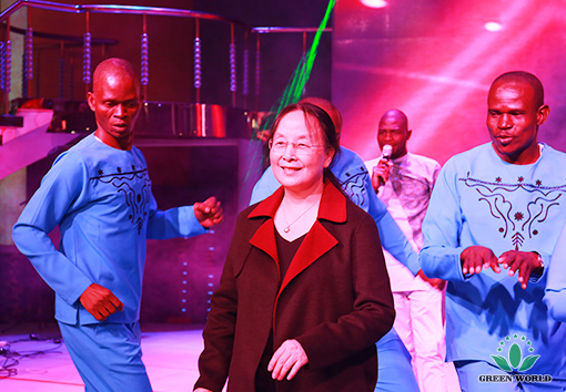 À 18h38 Dr Deming Li, président de Green World, escorté par les membres de notre famille africaine devant et derrière, est monté sur la scène.