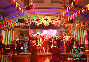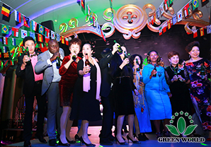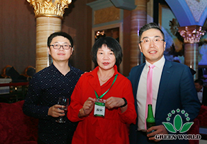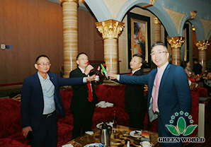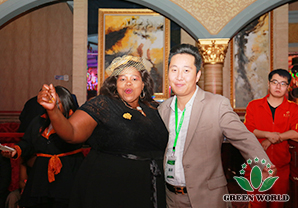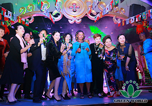 Dr Deming Li, président de Green World, M. Linhai Yan, directeur général adjoint de Green World Chine, M. Jiakun He, directeur du marketing de Green World Chine, et des élites nationales et étrangères comprenant plus de 60 distributeurs de l’Afrique et de l’Amérique du Nord, tous habillés pour assister au dîner de Green World Global Elite.
