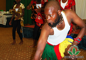 Un groupe de danse composé en partie par des distributeurs exécutant la danse folklorique locale